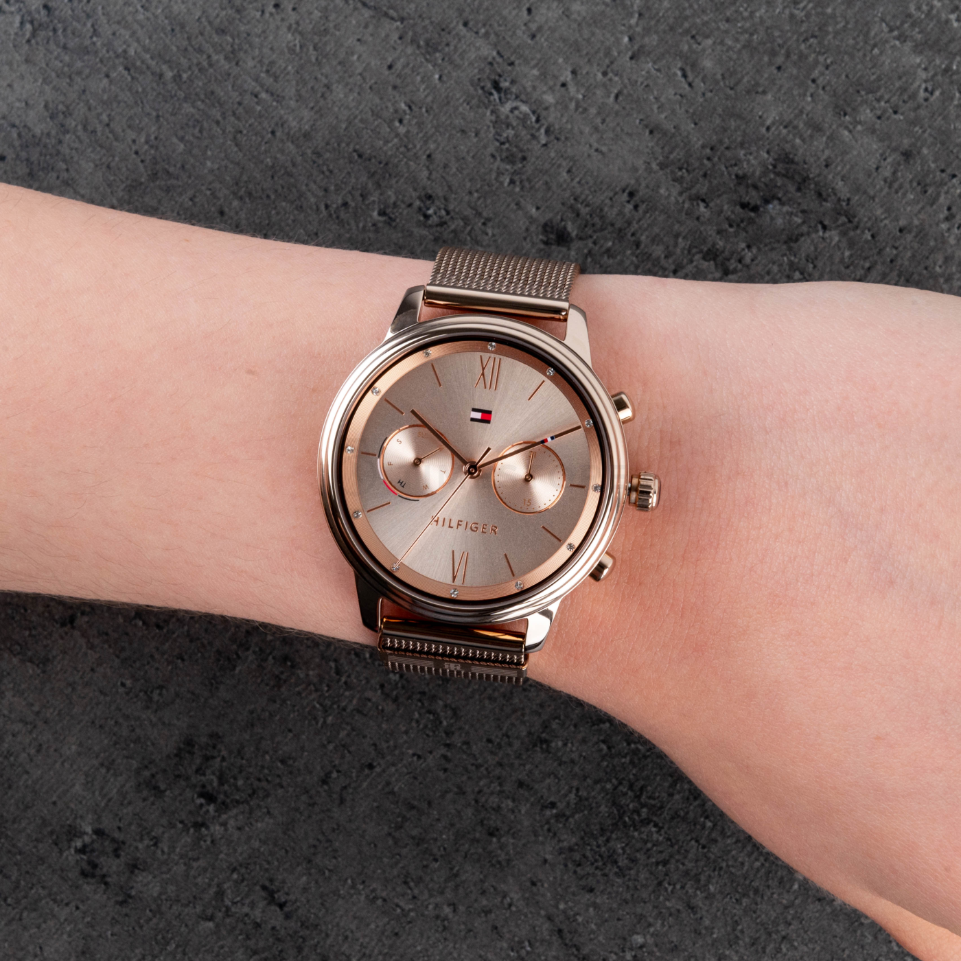 Dobre vyzerajĂşce hodinky sĂş istotne nezameniteÄľnĂ˝m dámskym doplnkom a vybranĂ˝ kĂşsok od znaÄŤky Tommy Hilfiger je toho jednoznaÄŤnĂ˝m dĂ´kazom. PriblĂĹľme si teda detailnejšie vlastnosti tĂ˝chto hodiniek. VyobrazenĂ© hodinky Tommy Hilfiger 1782303 majĂş zaujĂmavĂ˝ cifernĂk a ich veÄľkosĹĄ je 38 x 8.95 mm. Farba pĂşzdra je pri tomto modeli luxusná ruĹľovozlatá, priÄŤom hlavnĂ˝m materiálom, z ktorĂ©ho je pĂşzdro vyrobenĂ©, je nerezová oceÄľ s pozlátenĂ˝m ruĹľovĂ˝m zlatom na povrchu. DĂ´leĹľitĂ˝m dielom hodiniek je nepochybne ich remienok. Model 1782303 má remienok, ktorĂ©ho základ tvorĂ oceÄľ s PVD povlakom. Ako ste si asi mohli všimnúť, remienok má farbu, ktorá je ruĹľovo - zlatá. Tieto fešandy od Tommy Hilfiger bezpochyby spestria váš outfit a vy nebudete kĂşpu urÄŤite lutovaĹĄ.