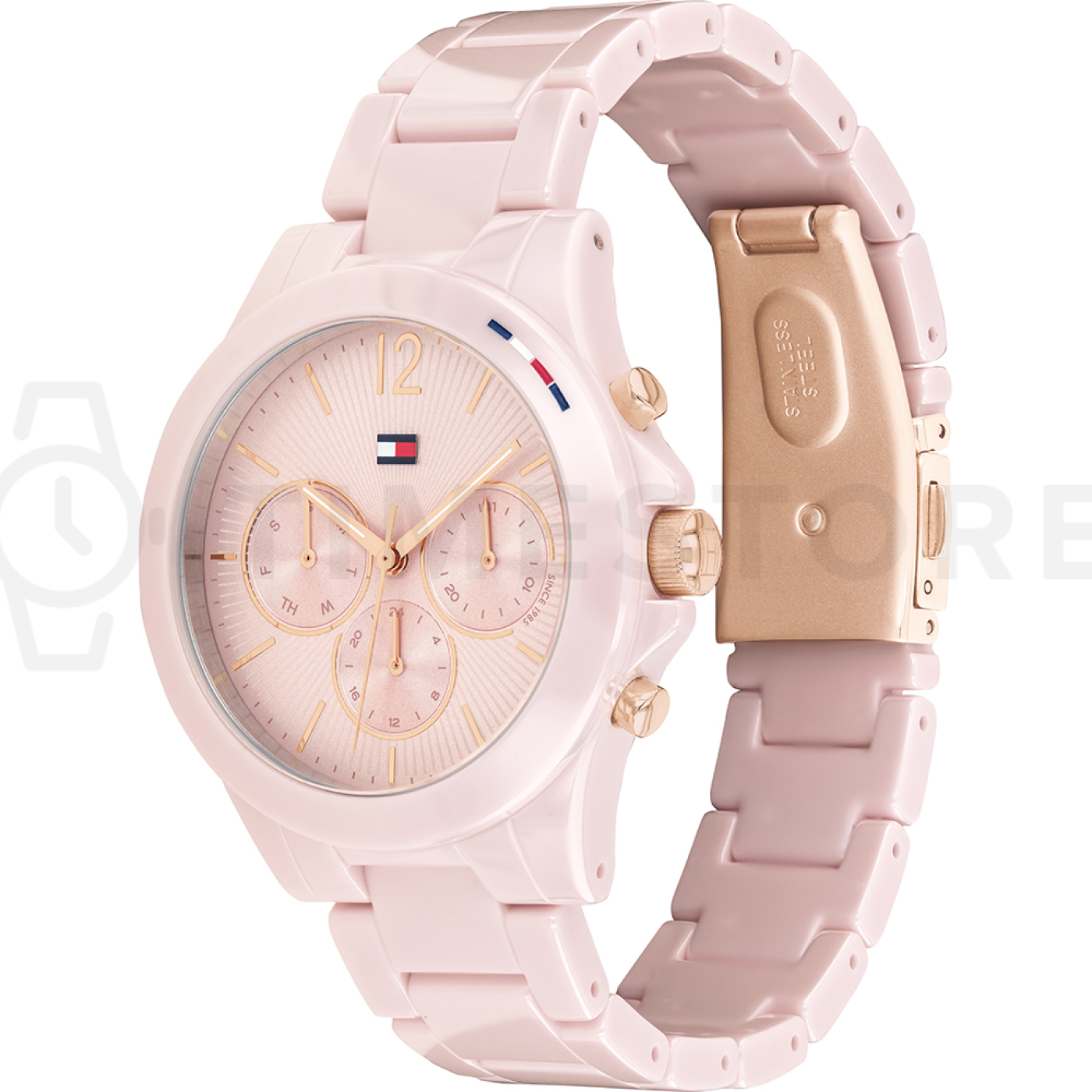 Elegantné hodinky sú nepochybne nezameniteľným módnym doplnkom a tento kúsok od značky Tommy Hilfiger tieto slová jednoznačne potvrdzuje. Priblížme si teda viac podrobnejších vlastností týchto hodiniek. Zobrazený model Tommy Hilfiger 1782203 skrášľuje pekný ciferník, ktorého farba je ružová, pričom veľkosť týchto hodiniek je 38 mm. Pohľadný ciferník tohto kúsku upevňuje solídne keramické púzdro a jeho farba je pri tomto modeli hravá ružová. Keramický remienok držiaci púzdro je v krásnej farbe, ktorá je v prípade modelu 1782203 ružová. Dlho však neváhajte, tieto pekné hodinky značky Tommy Hilfiger čakajú už len na to, ako ich zaradíte do svojho outfitu.