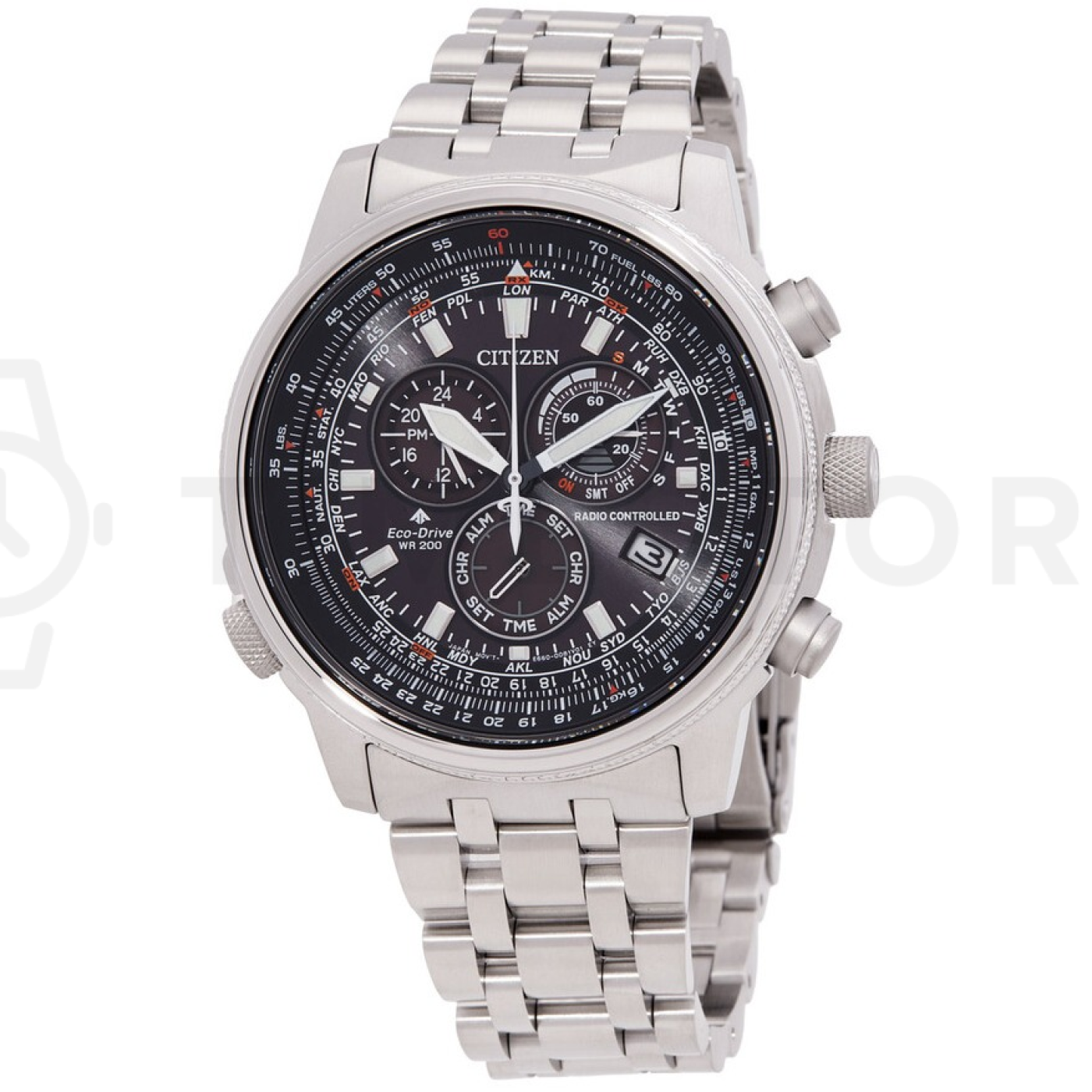 - Luminiscenčné ručičky, 24 hodinový subciferník, Chronograf, Luminiscenčné indexy, Indikátor nabitia batérie, Ukazovateľ dní v týždni, Alarm, Večný kalendár, Svetový čas, Rádiovo riadené